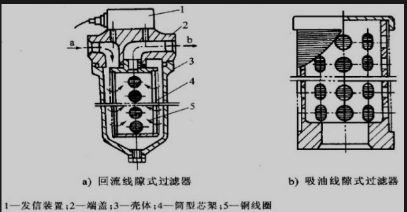 线隙式过滤器的滤芯,是一种用铜线或者铝线紧密缠绕在筒形骨架上的滤芯,油液经过金属线之间的孔隙,进入内部,再从上方的孔道流出,这种过滤器结构简单,通量大,特别适合于要求不间断地精细过滤油品的场合,多用于回油过滤。但过滤器的结构较为复杂、制造精度要求较高,且滤芯材料强度低,不易清洗。