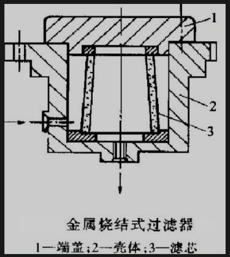 该过滤器用金属粉沫(不锈钢、纯镍、纯铁)烧结成多孔材料作过滤元件,能够承受高压,过滤精度高,属于深度型过滤器。缺点是颗粒容易脱落、堵塞,不易清洗。