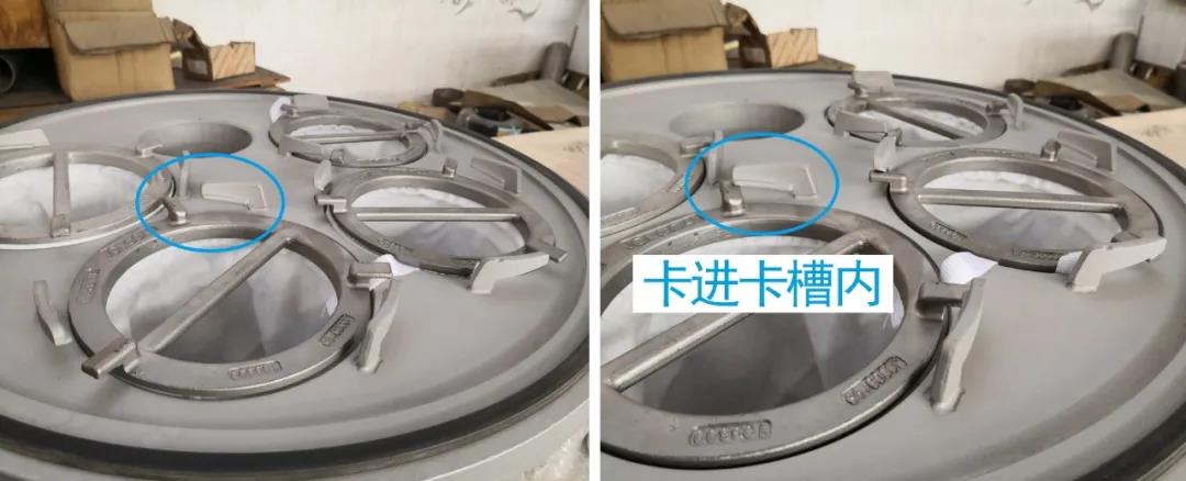 • 放上大香蕉视频网站卡环(左图),顺时针压紧滤袋卡环(右图),用扳手等工具进一步卡紧卡环。